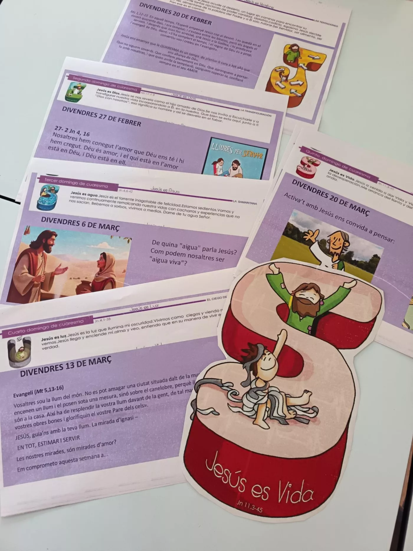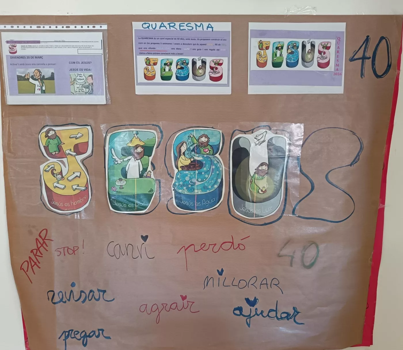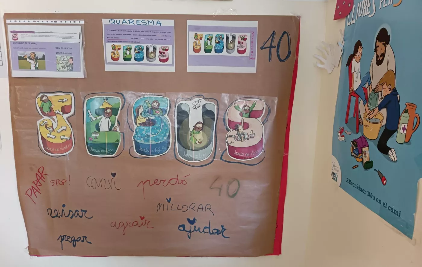 A la resta de primària, la Quaresma s’ha treballat a partir del nom de Jesús. Lletra a lletra, l’alumnat ha anat aprofundint en la seva figura: home, Fill de Déu, qui ens ofereix aigua viva, ens dona llum, ens guia i ens regala la vida. Un recorregut que els ha permès conèixer millor qui és Jesús i el seu missatge.