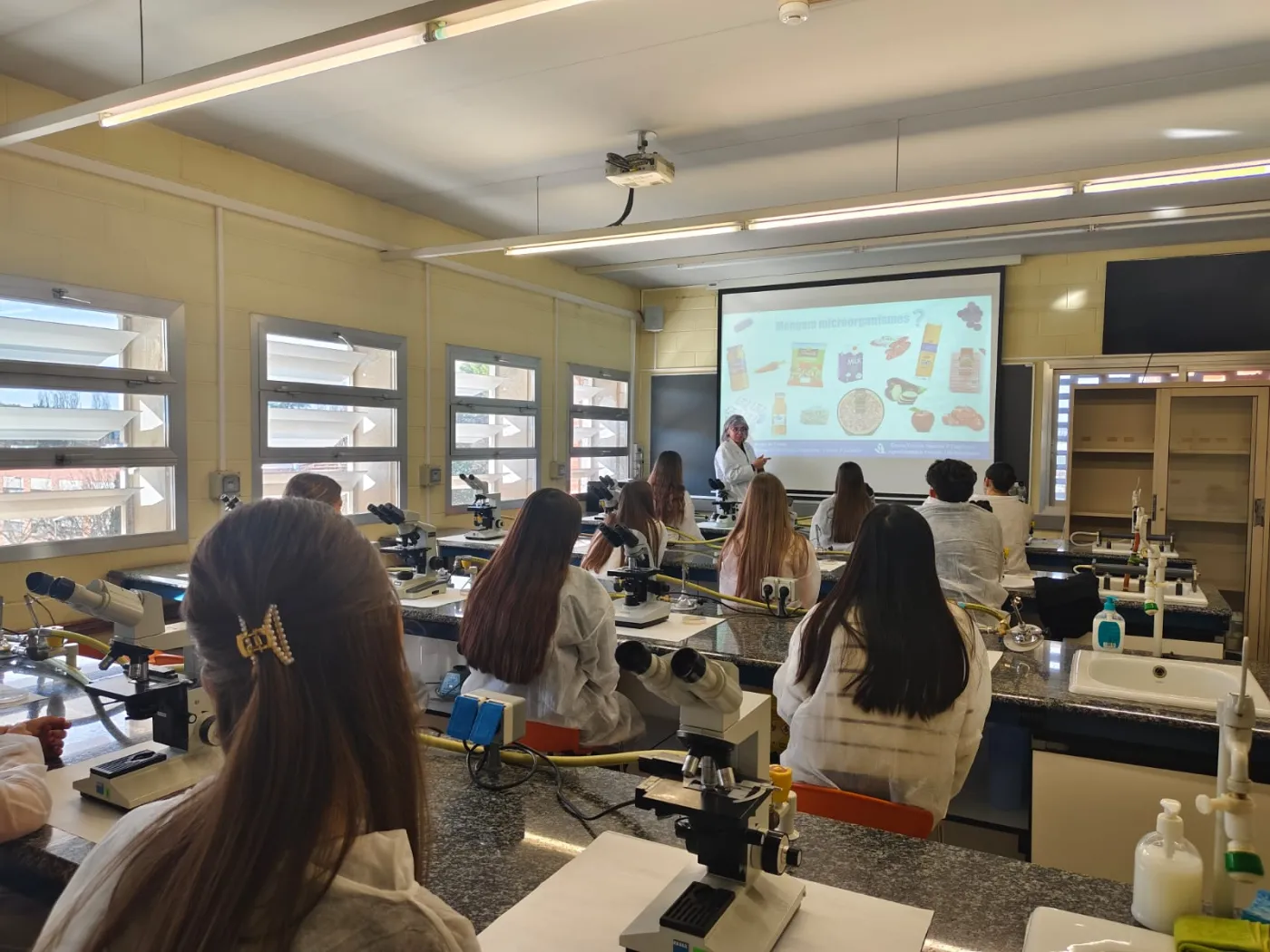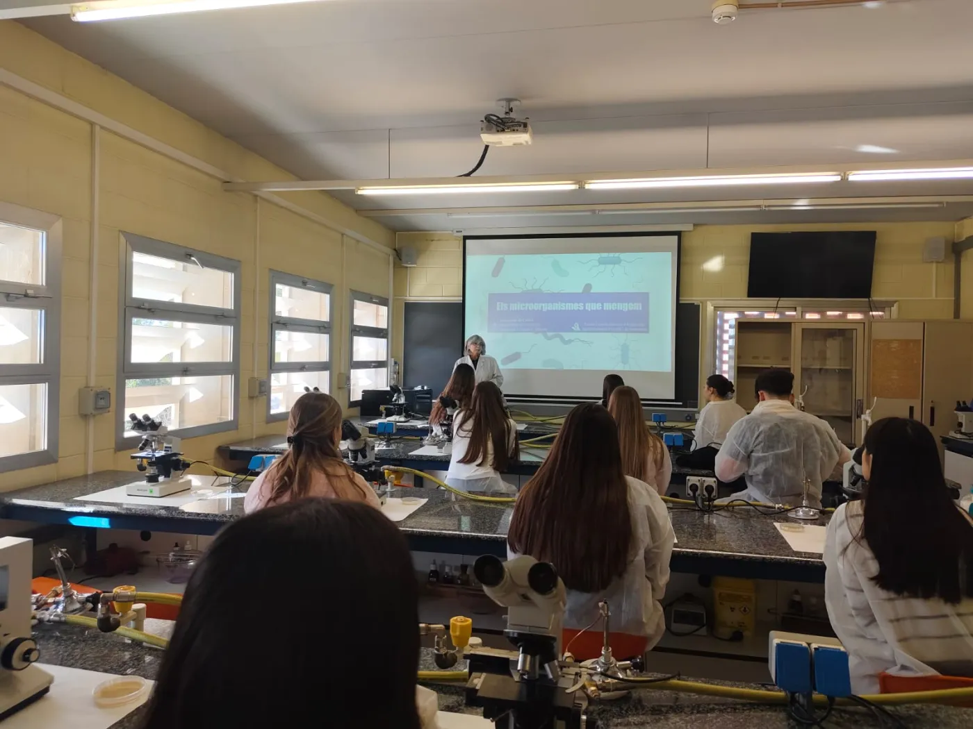 El segon taller es va realitzar als laboratoris universitaris i va estar centrat en l’estudi dels microorganismes beneficiosos per als aliments. Es va parlar del paper que tenen en la conservació i producció de productes com el iogurt, el fuet i altres aliments fermentats. A més, els i les alumnes van poder observar diferents microorganismes al microscopi, com ara bacils, cocs i llevats.