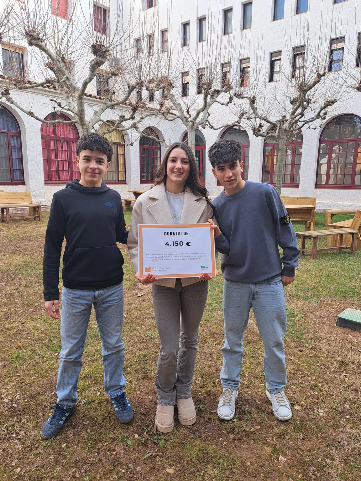 Acompanyats per les professores Diana Folguera i Cristina Ardanuy, en Jan, la Joana i el Pau van aconseguir guanyar un total de 4.150 €, que van lliurar simbòlicament en un xec a Roger Torres, president de la Fundació Arrels. L’entitat destinarà aquests fons a l’adequació i manteniment dels pisos de la comunitat, oferint suport a persones en situació de risc d’exclusió social o amb problemes d’addiccions, ajudant-les a tenir una oportunitat de millora en la seva vida.