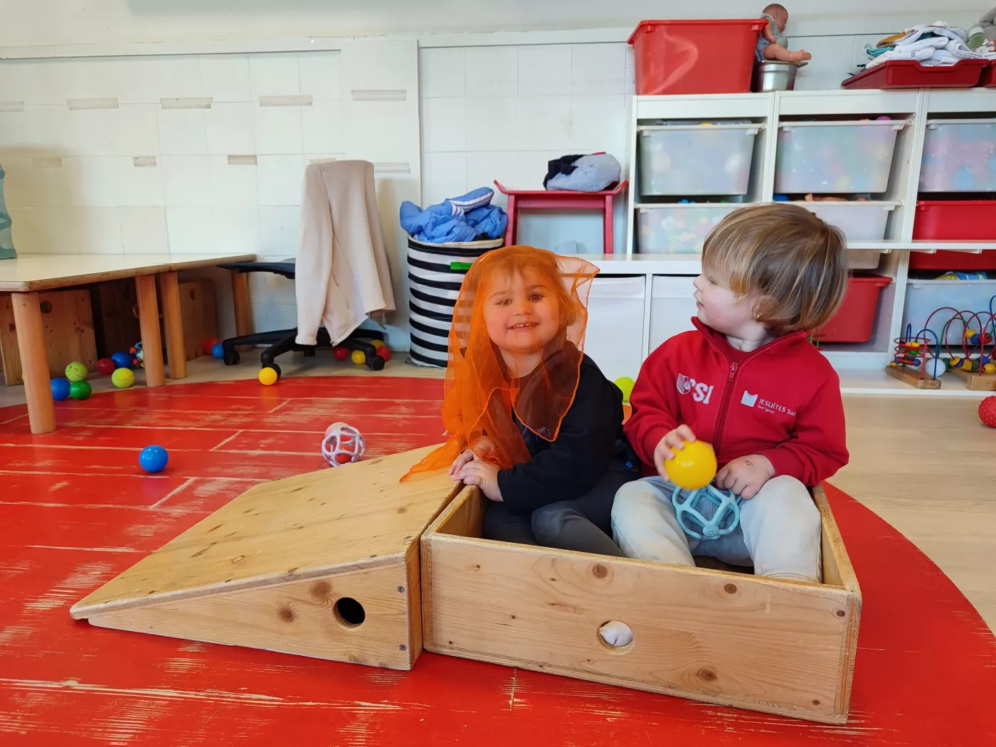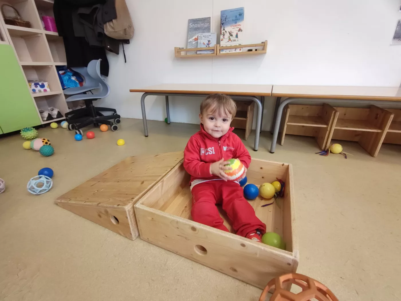 Per afavorir aquesta pràctica, disposem d’un mobiliari de fusta específic: triangles, rampes, calaixos, graons i gronxadors, entre d’altres.