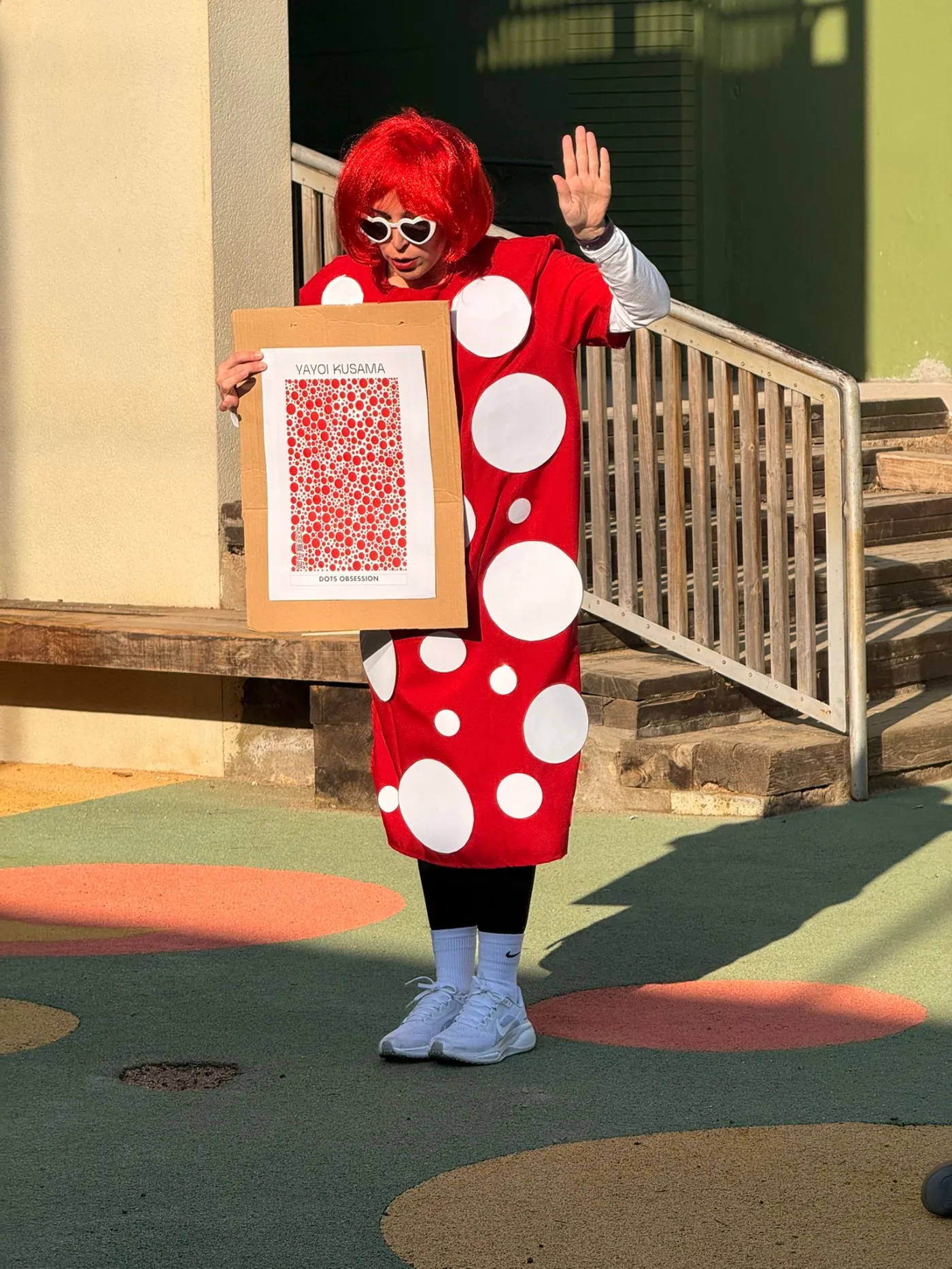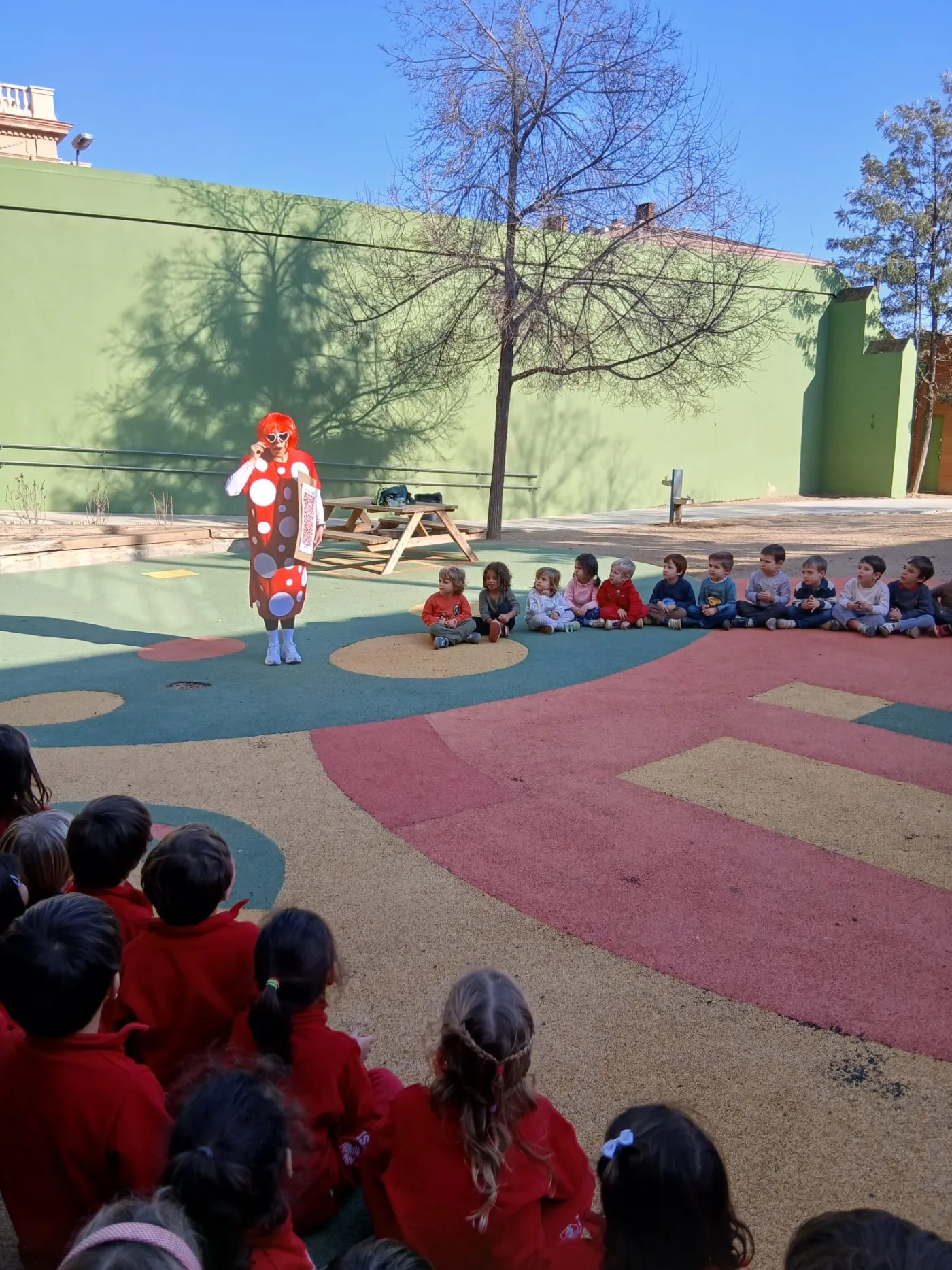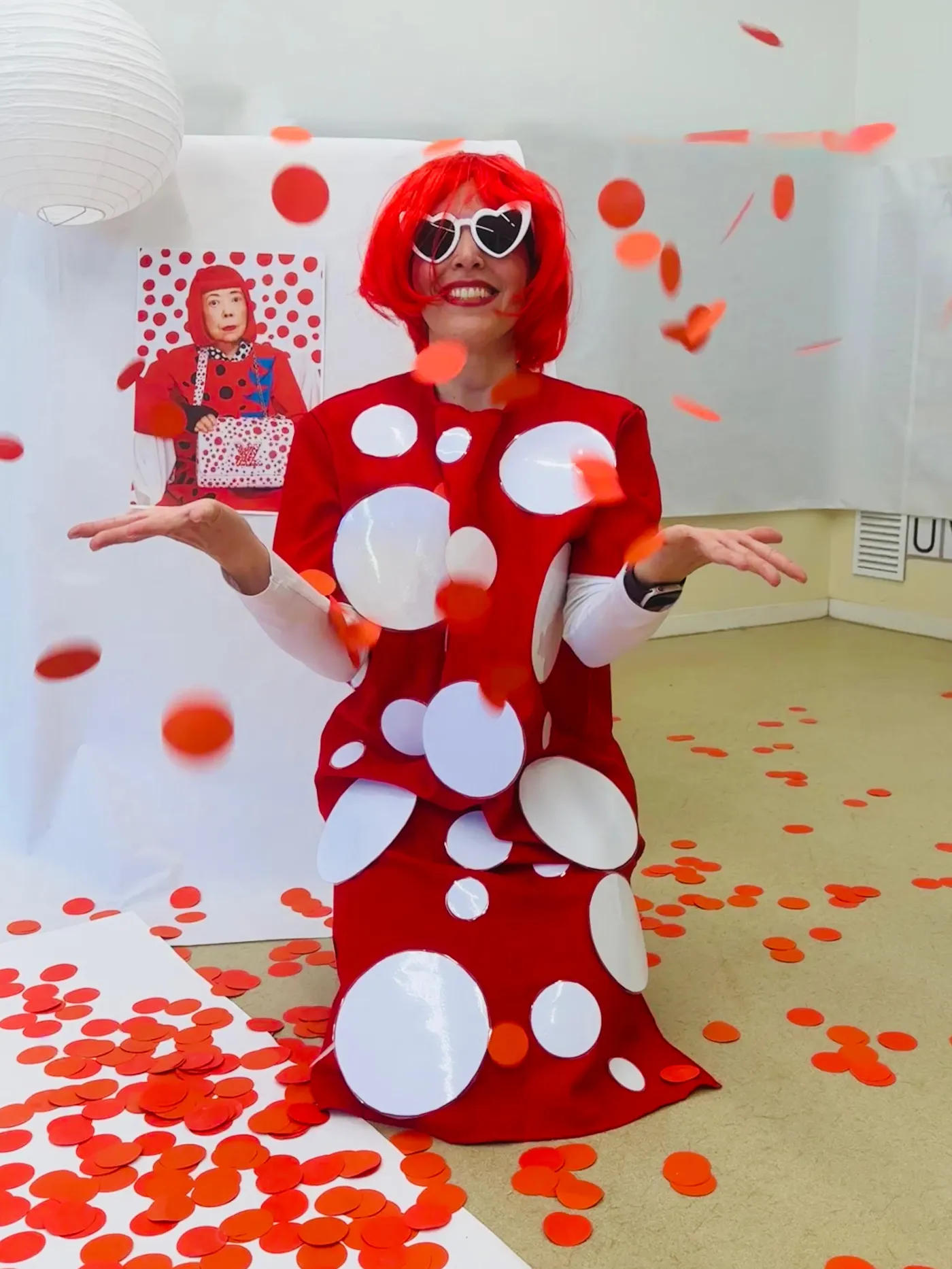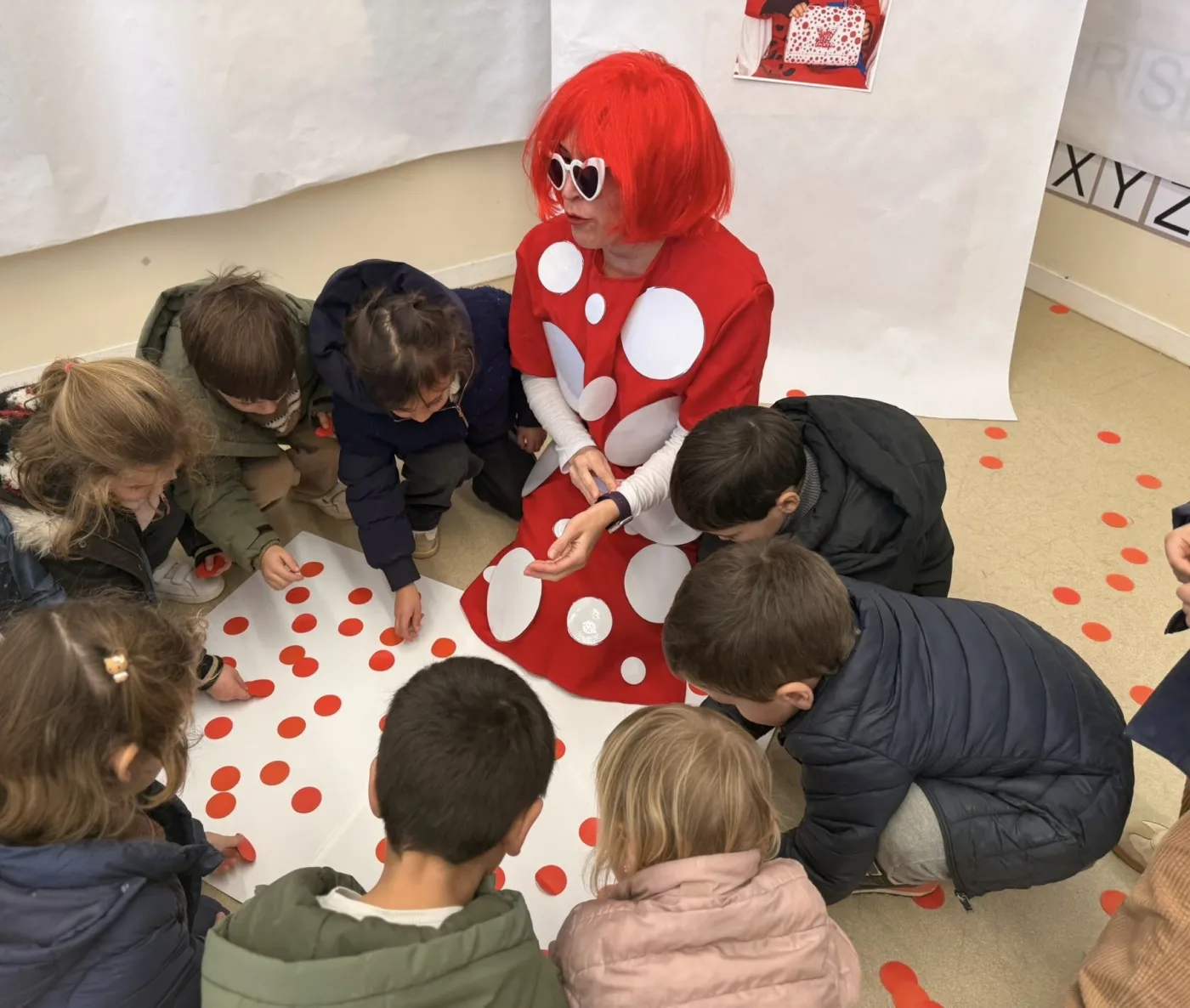 A través dels punts, els patrons repetitius i l’ús intensiu del color, els nens i nenes han pogut explorar noves formes d’expressió artística, tot desenvolupant la creativitat i la capacitat d’observació. L’activitat ha culminat amb una visita molt especial: “Yayoi Kusama” ha vingut a l’aula per veure de primera mà com els alumnes estaven treballant la seva obra i interpretant el seu estil.