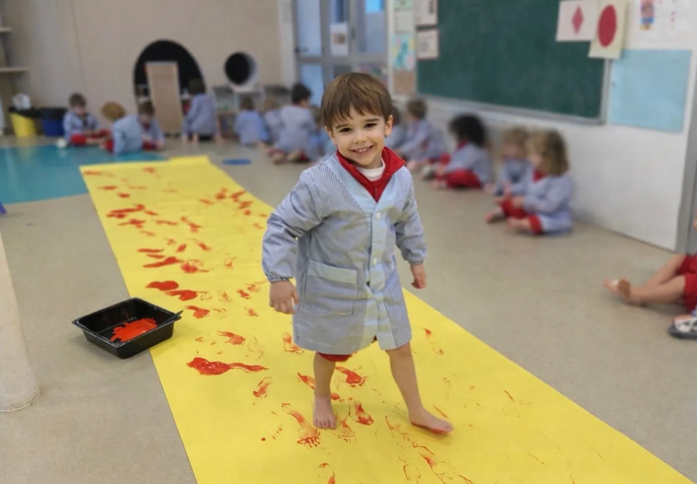 Inspirant-nos en la seva manera lliure i expressiva d’entendre la pintura, hem proposat als infants una activitat de pintura amb els peus. Aquesta vivència els ha permès explorar el color, el traç i el moviment amb tot el cos, transformant l’acció de pintar en un acte vivencial, espontani i profundament expressiu.