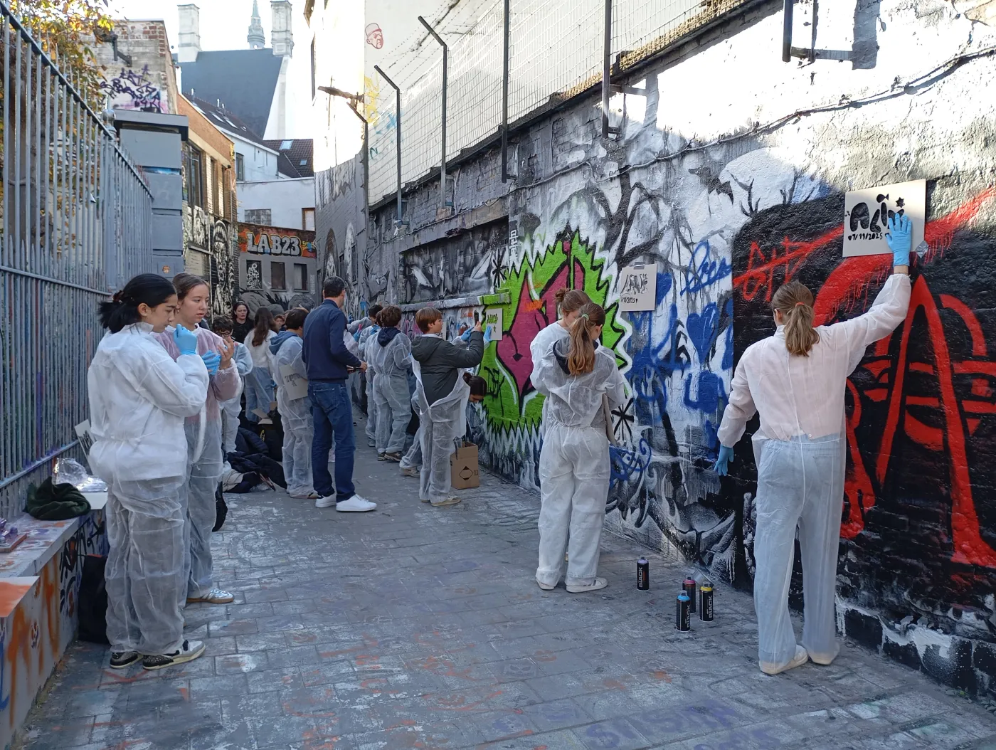 També hem fet activitats més creatives. Per exemple, el tercer dia vam fer una plantilla per a fer un graffiti. El primer pas era dibuixar-ho a un paper i enviar-ho al professor en format de fotografia. Posteriorment, vam imprimir-ho amb una impressora làser. Amb la plantilla feta vam fer un graffiti a un carrer molt típic de Ghent on tothom pot fer grafits legalment. Per últim, vam anar al museu de la indústria, on vam estampar els nostres propis dissenys en unes samarretes.