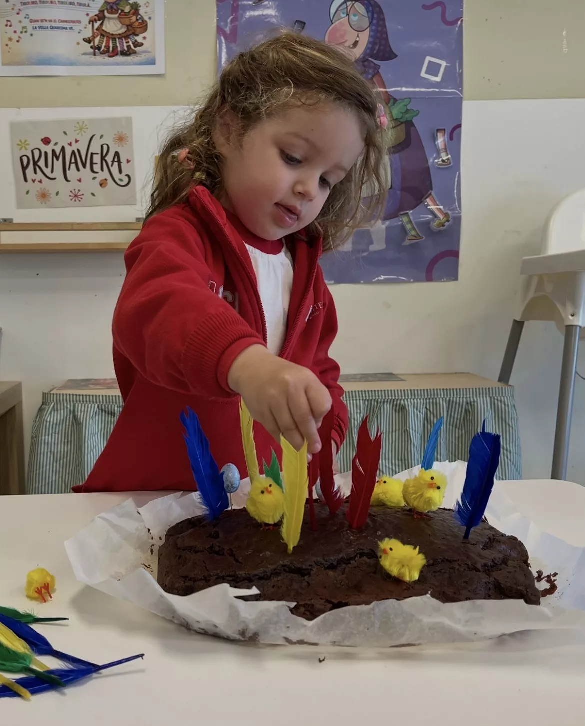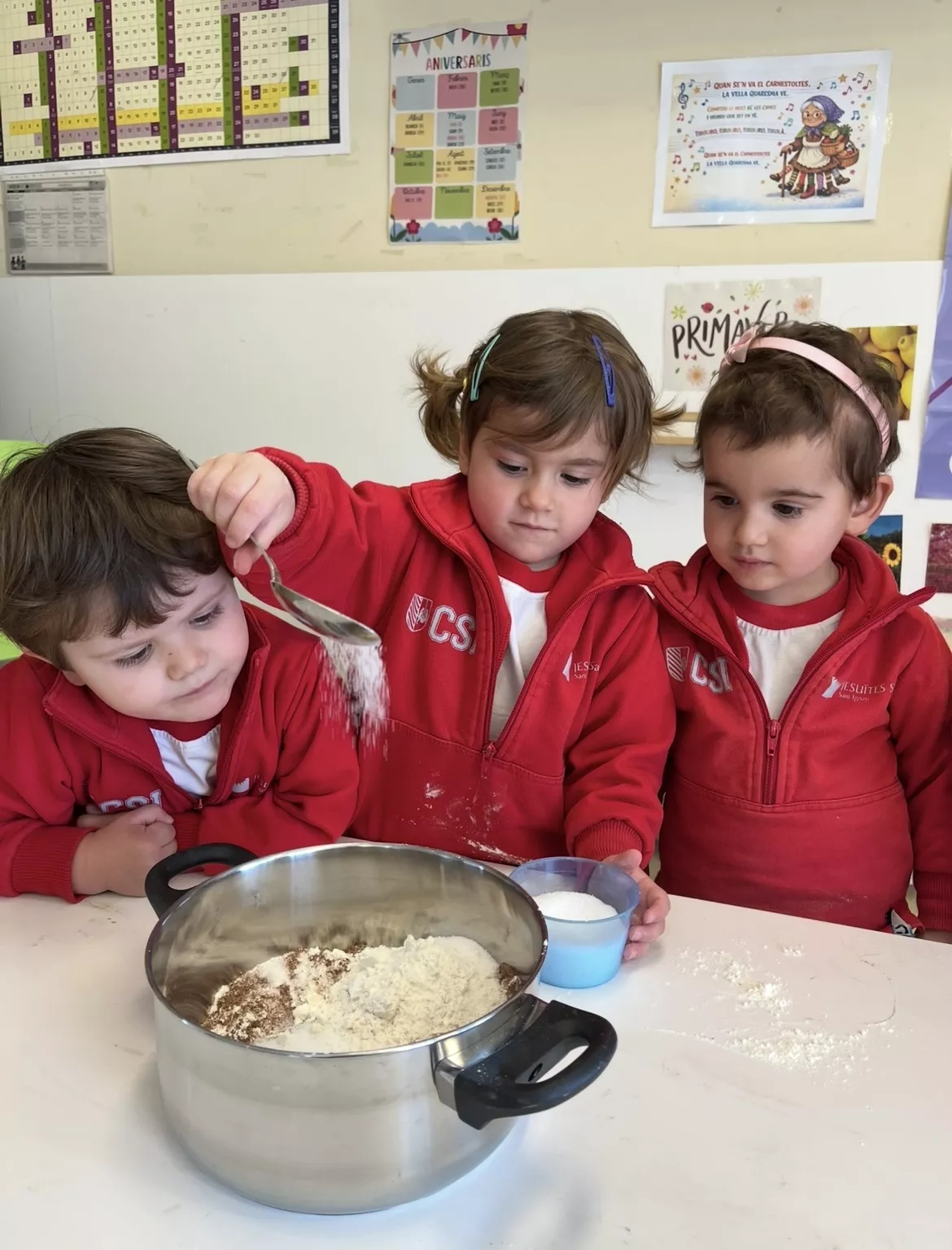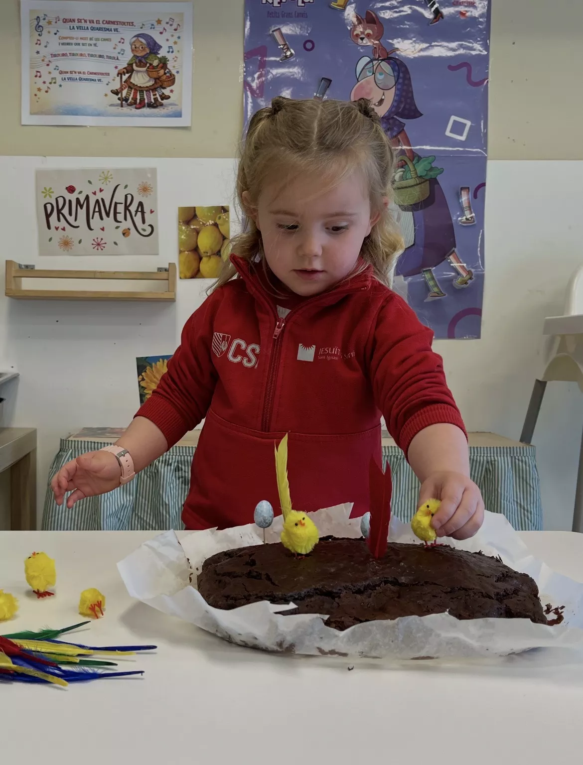 Una de les activitats principals ha estat l’elaboració de la nostra mona de Pasqua: hem anat afegint ingredient a ingredient, observant el procés i participant activament en la preparació. Després l’hem portat a la cuina de l’escola per enfornar-la, i a la tarda l’hem decorat amb elements típics i… finalment, l’hem pogut gaudir per berenar!